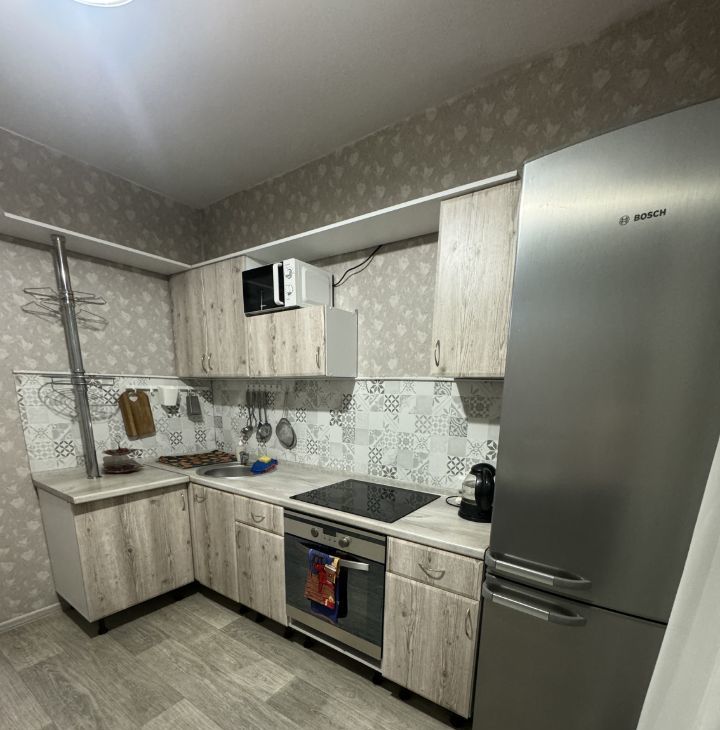 В коридоре - гигантский шкаф-купе с зеркалами. На кухне - встроенная духовка и варочная панель, вместительный холодильник, гарнитур, стол, стулья, посуда. Есть кабельное ТВ.