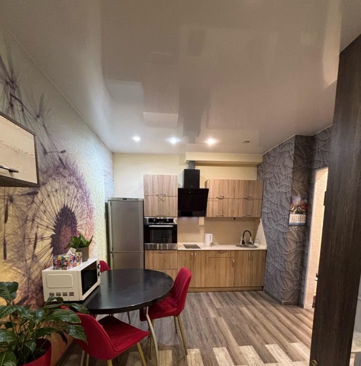 Квартира обустроена большой кухней гостинной и отдельно спальной комнатой.