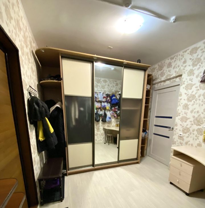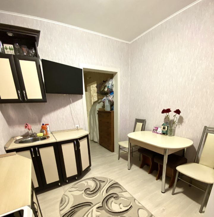 В коридоре шкаф, на кухне: кухонный гарнитур, холодильник, плита, микроволновка, стол, стулья, телевизор,стиральная машина.