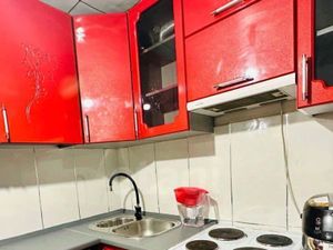 Кухонный гарнитур, электро плита с духовкой, кровать , обеденная группа, НОВЫЙ диван, тумба ТВ, стиральная машинка автомат, холодильник, чайник, шкаф.