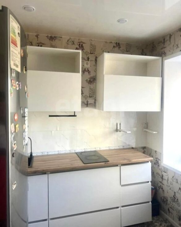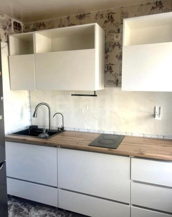 В квартире имеется: кухонный гарнитур, обеденный стол, холодильник, шкаф-стенка, диван, стиральная машинка.