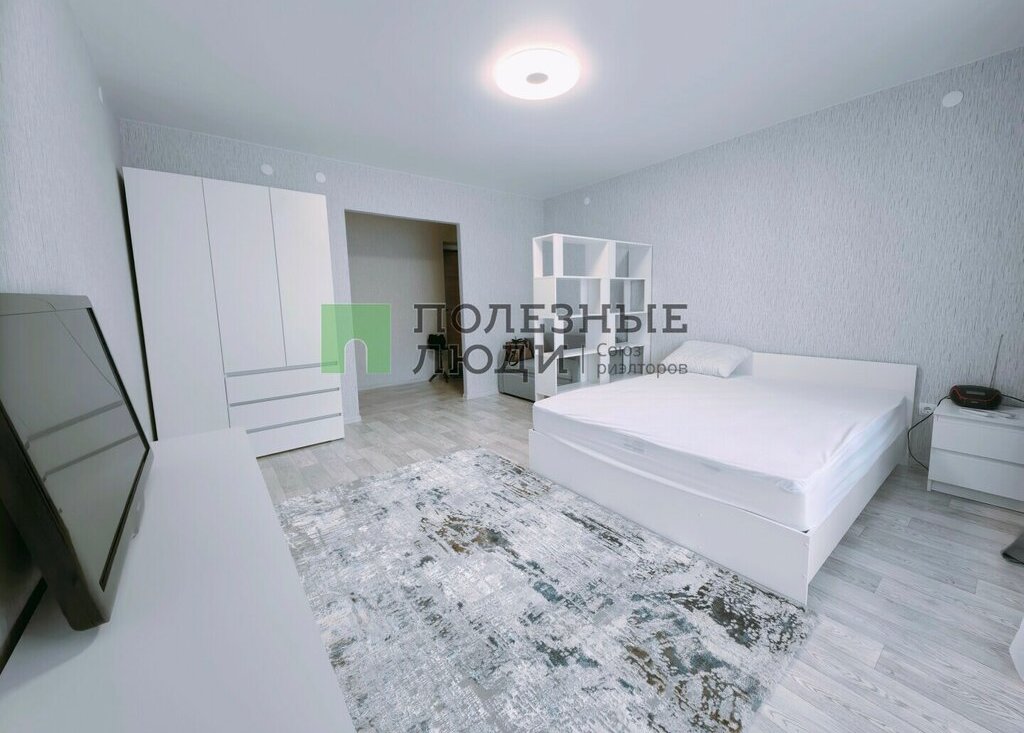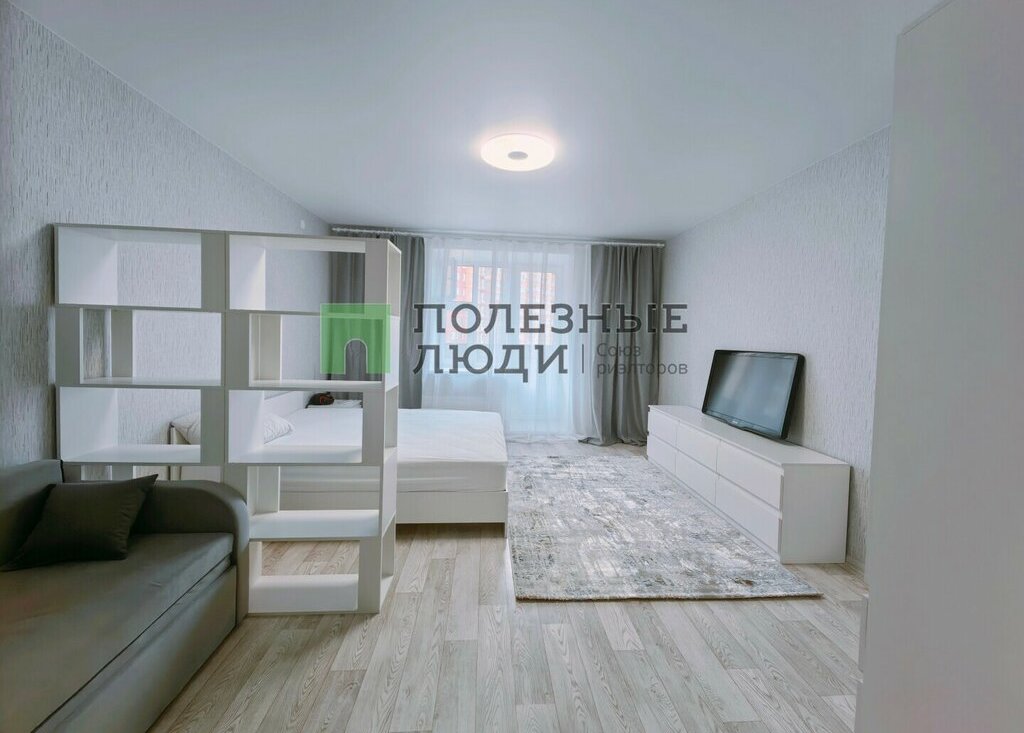 в гостиной комнате - кровать, прикроватная тумба, диван, шкаф для одежды, шкаф с полками, телевизор, тумба для телевизора