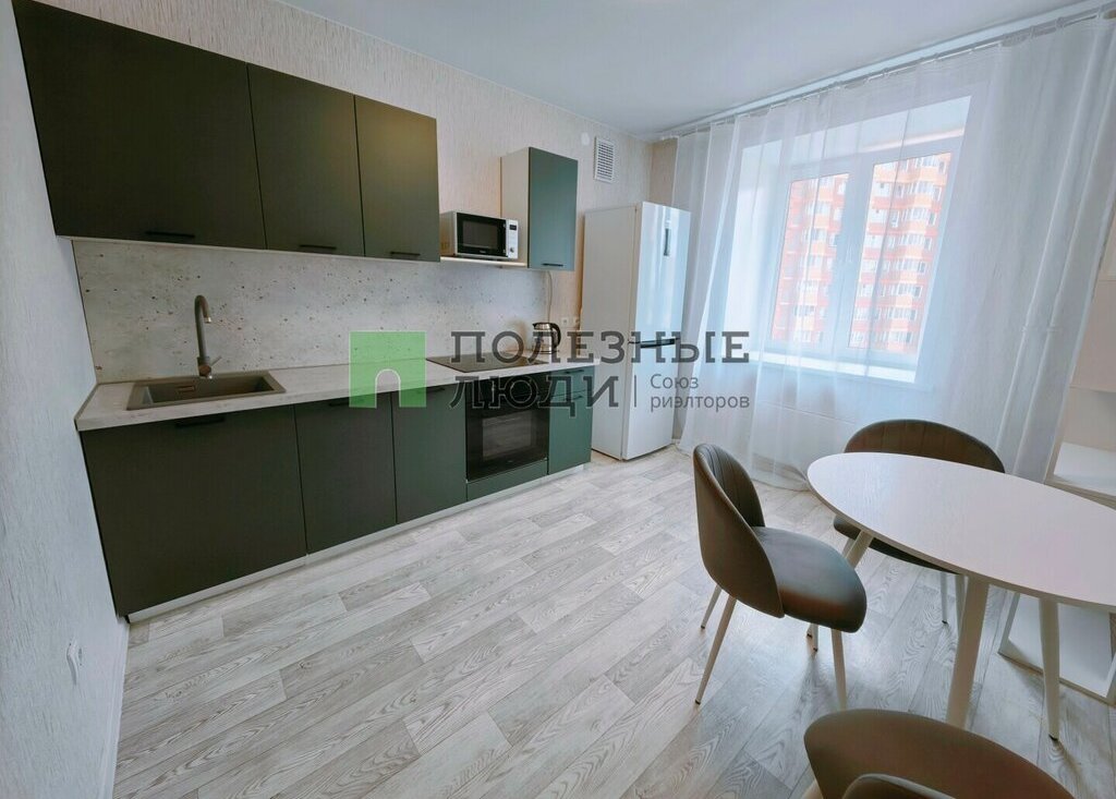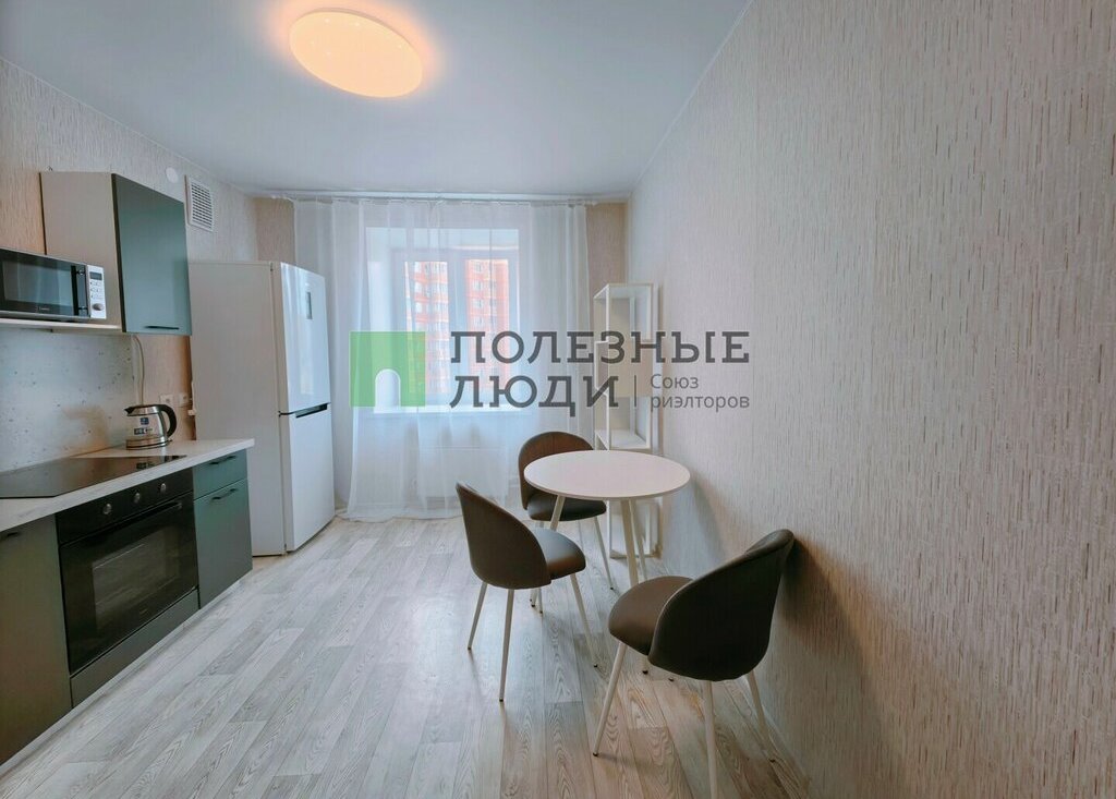 на кухне кухонный гарнитур техникой - холодильник, духовой шкаф, варочная индукционная панель, микроволновка, чайник, обеденная зона - стол и стулья