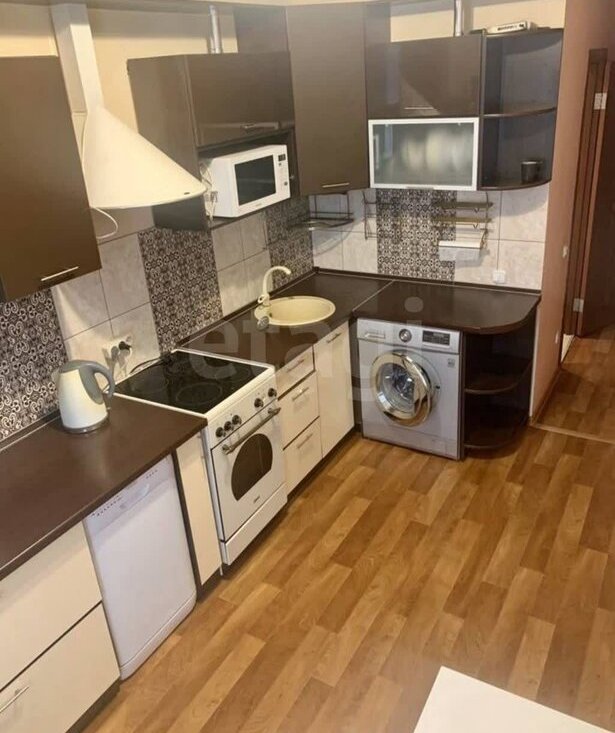 В квартире есть всё для проживания- холодильник, стиральная машинка, микроволновка, диван, кух. гарнитур, стол, стулья, телевизор, чайник, проведен интернет, посудомойка