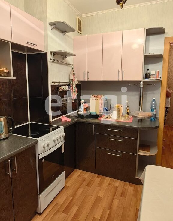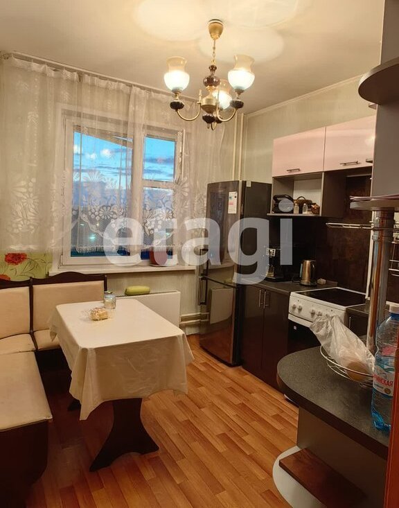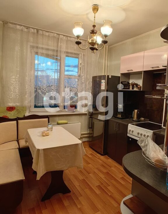 В квартире есть: два дивана, холодильник, электрическая плита, кухонный гарнитур, обеденный уголок, стиральная машинка, чайник.