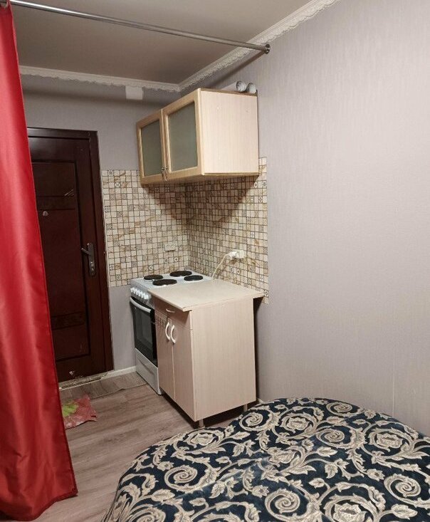 В комнате диван, комод, холодильник, плита, кухонные шкафы.