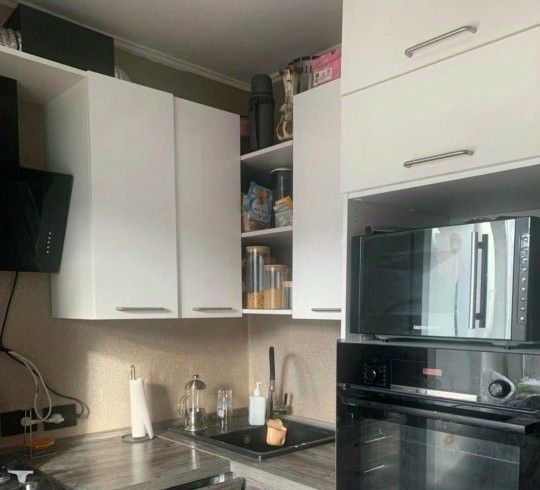 На кухне встроенная бытовая техника: варочная плита, вытяжка, духовой шкаф, микроволновка, посудомоечная машина.