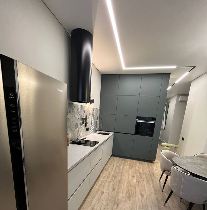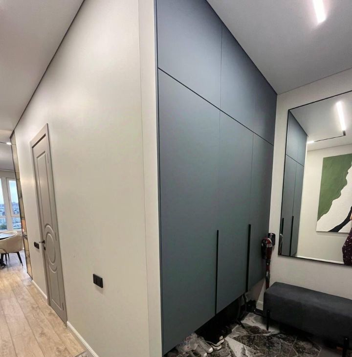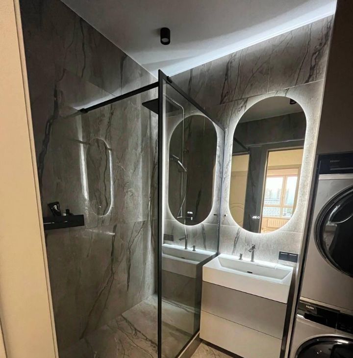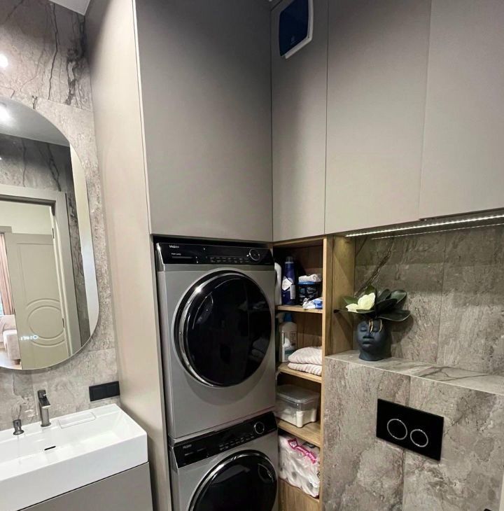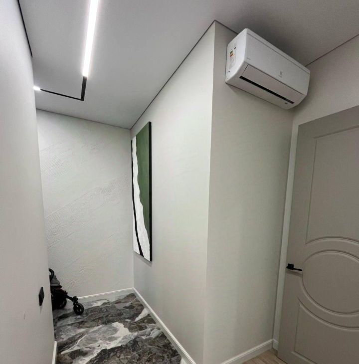 широкоформатный керамогранит, теплые полы, натяжные потолки, продуманное освещение. Просторная изолированная спальня, большое хранение для одежды, кондиционер, совмещенный санузел с постирочной зоной машинкой, сушилкой и импортной сантехникой