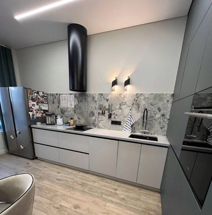 — все для вашего удобства и комфорта. Кухня полностью укомплектована современной техникой: холодильник, варочная панель, духовой шкаф, микроволновка, посудомоечная машина. Вся мебель и техника остаются жильцам!