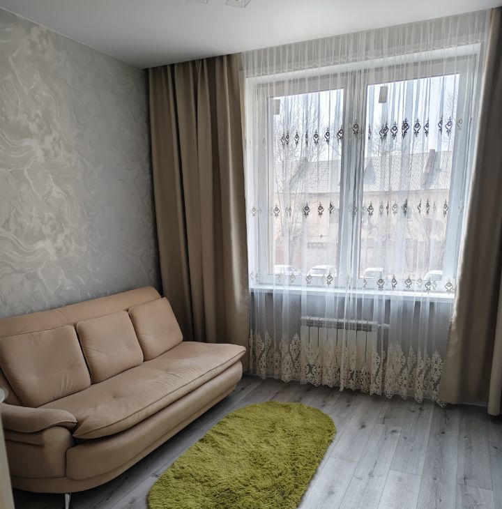В гостиной установлен стильный диван . Из окон открывается вид на паркинг. В спальне удобная кровать и телевизор.