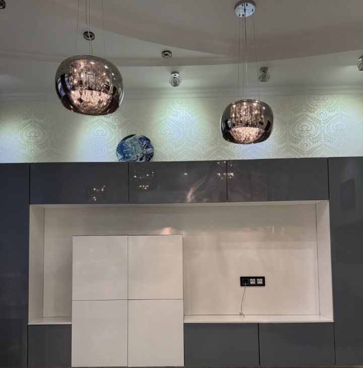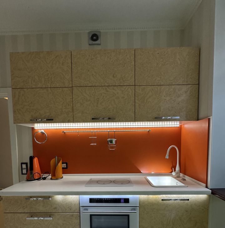 Кухня (так же как и вся мебель в квартире) на дорогих доводчиках Blum, столешница и фартук — искусственный камень.