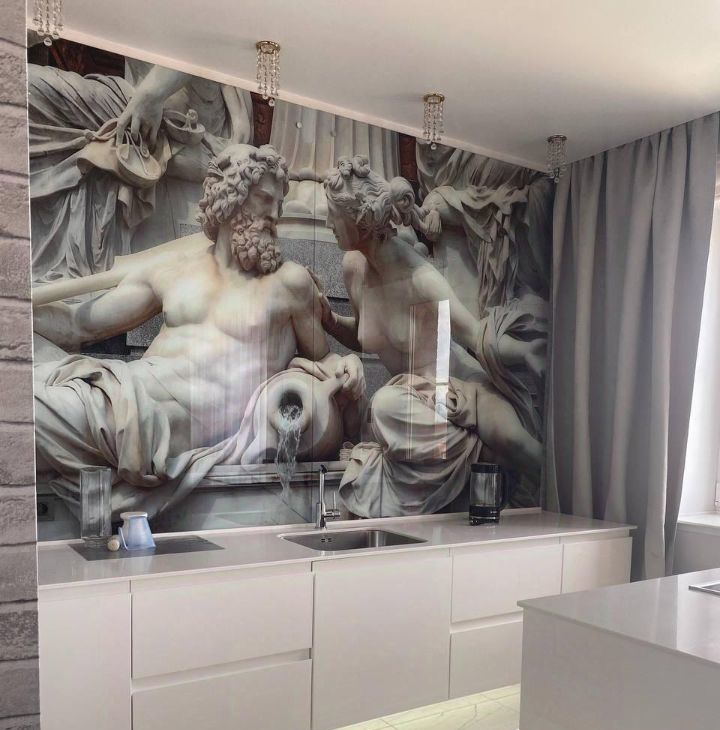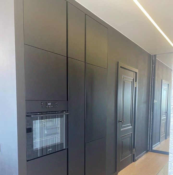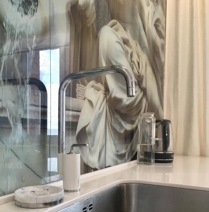 Кухня площадью 15м2 оформлена стеклянным панно. Кухонный гарнитур из окрашенного MDF, с фурнитурой Blum. Изящная столешница выполнена из акрилового камня. Встраиваемая бытовая техника: варочная панель и духовой шкаф Gorenje (не импортозамещение)), холодильник LIEBHERR. В квартире предусмотрены теплые полы в три контура, каждая зона включается стильной сенсорной панелью, что добавляет комфорта. Комнаты изолированные, санузел совмещенный с большой угловой ванной фирмы RIHO, золотым умывальником со смесителем BOHEMIA. На полу постелены керамогранит фирмы KERRANOVA, ламинат и пвх замковый из одной коллекции Quikc Step.