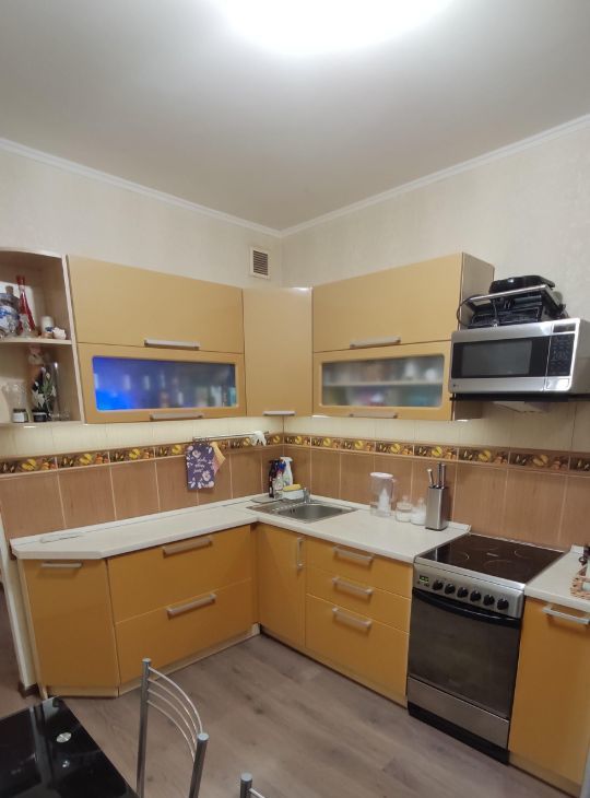 В квартире остаётся кухонный гарнитур и встроенные шкафы.