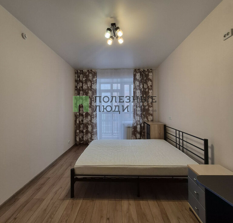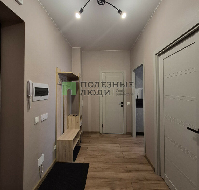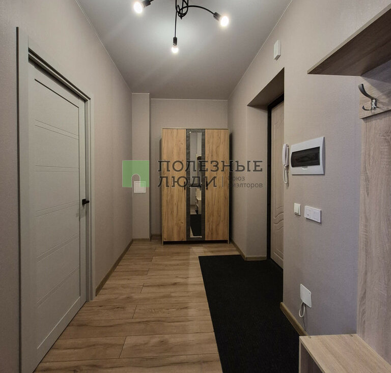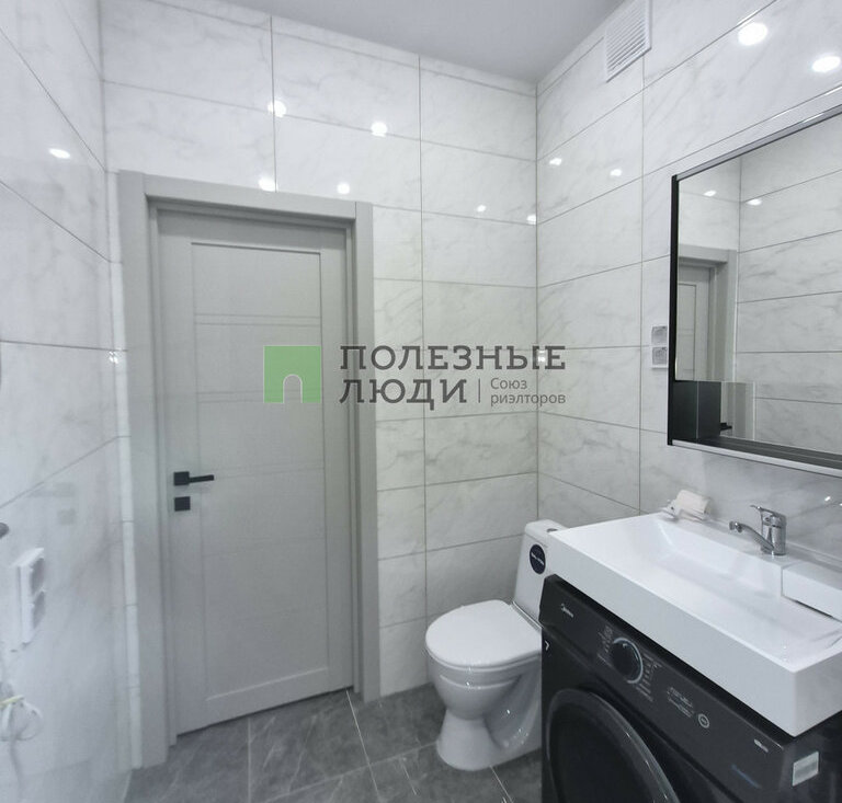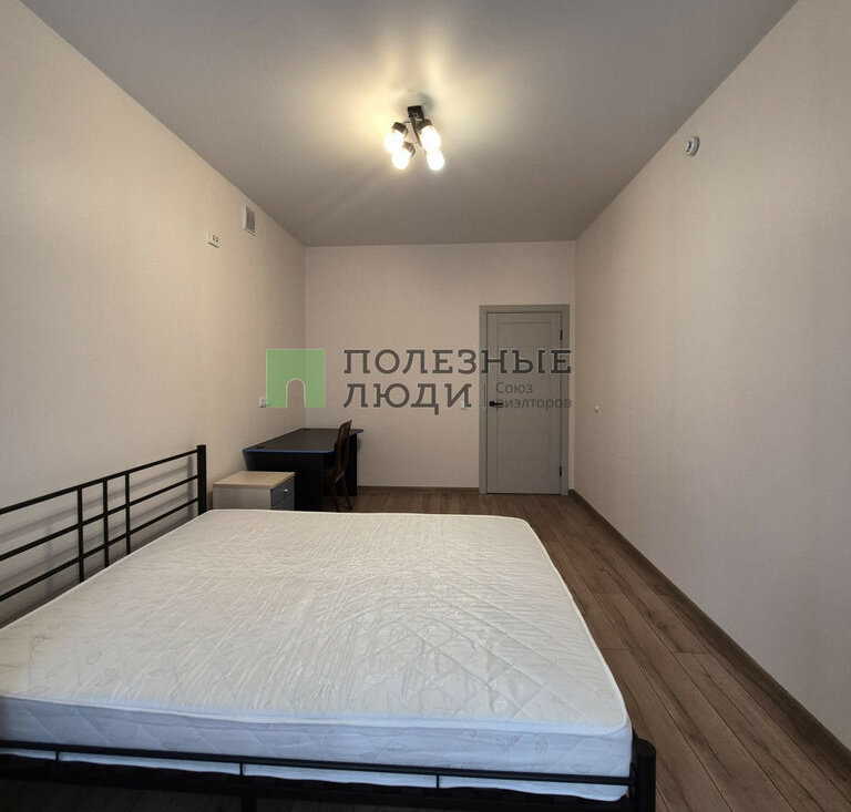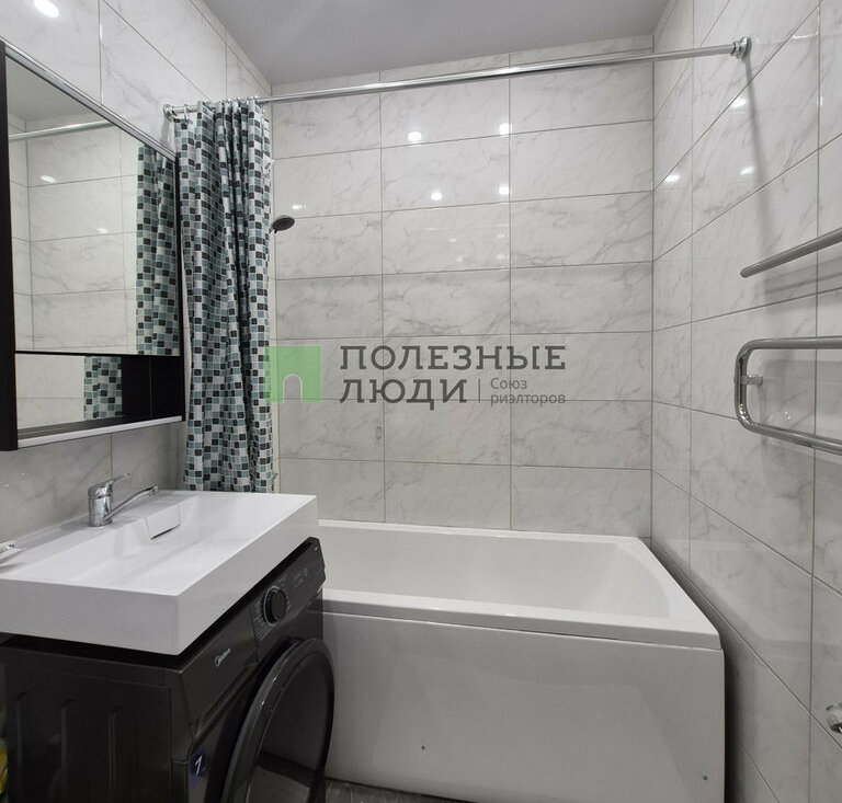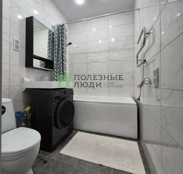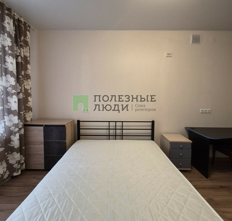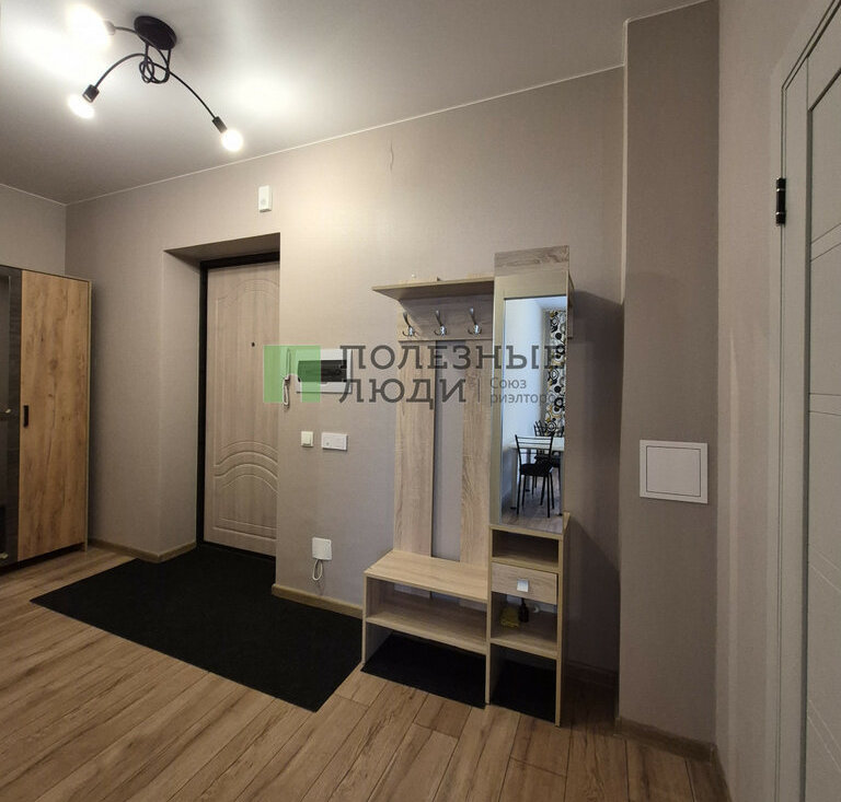 В комнате: двуспальная кровать с ортопедическим матрасом, прикроватная тумба и комод, рабочая зона. Большая входная зона в квартире, в которой есть вместительный плательный шкаф и прихожая с зеркалом. В ванной комнате установлена стиральная машина.