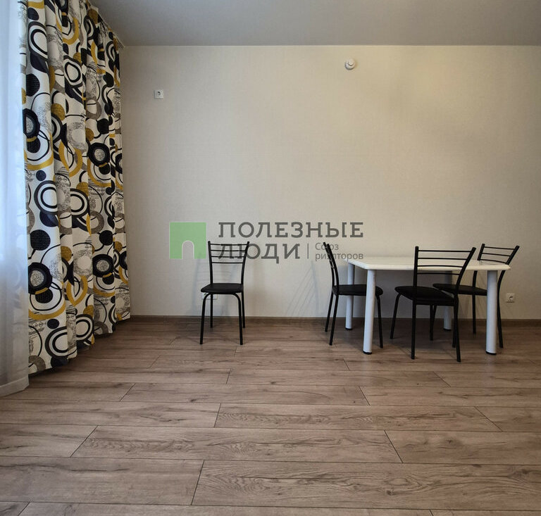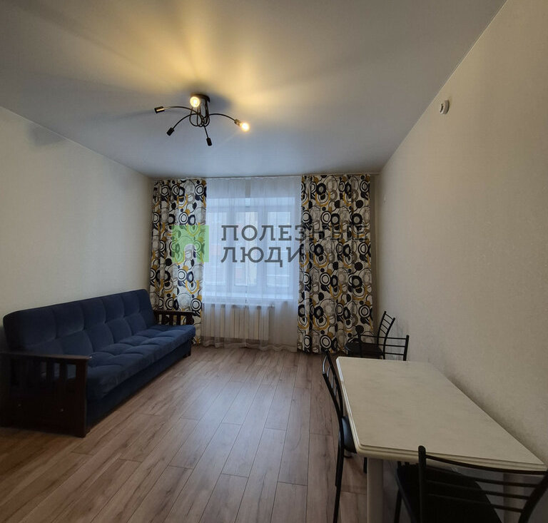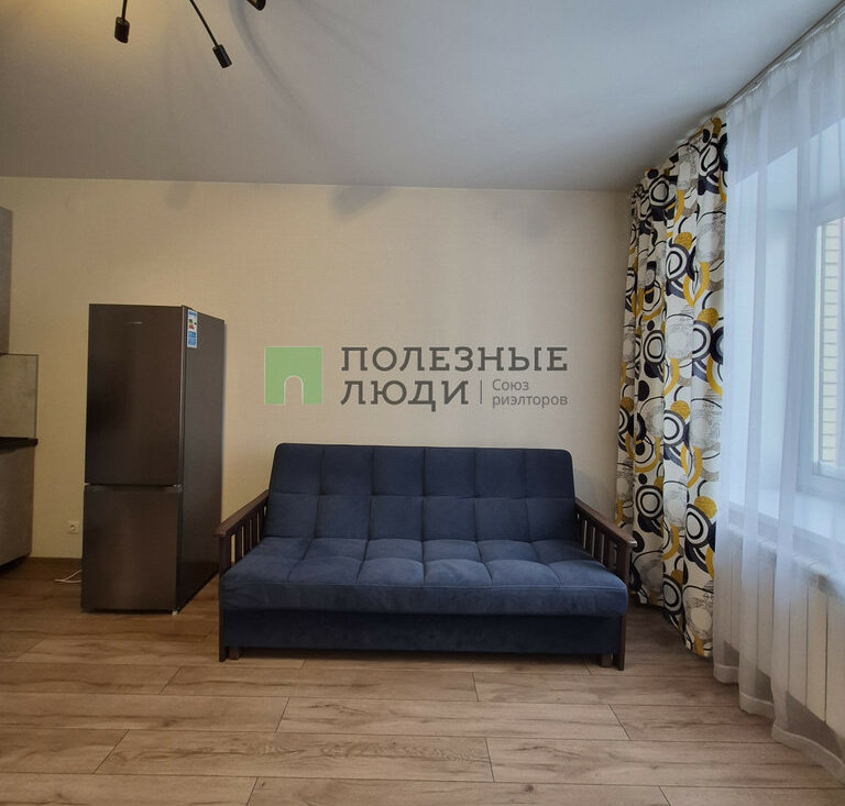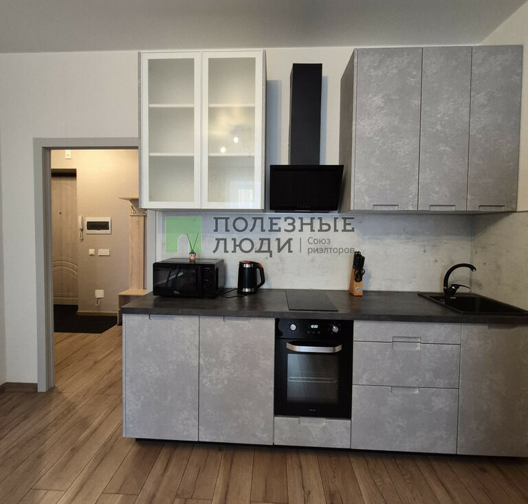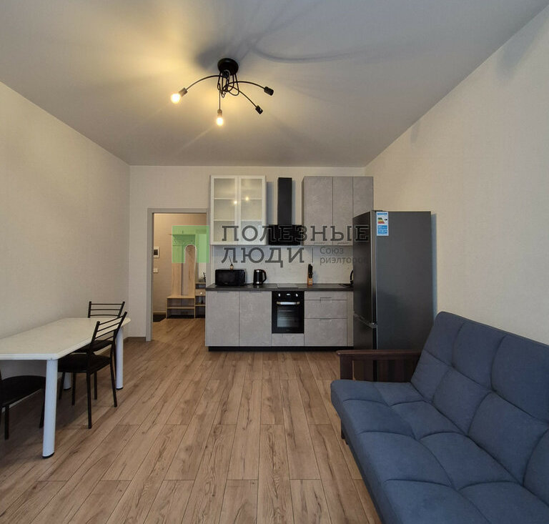 В куxне-гостинной есть все необходимое для комфортного быта, а именно: кухонный гарнитур с варочной панелью и духовым шкафом, вытяжка, холодильник, СВЧ, чайник, обеденная группа и удобный диван.