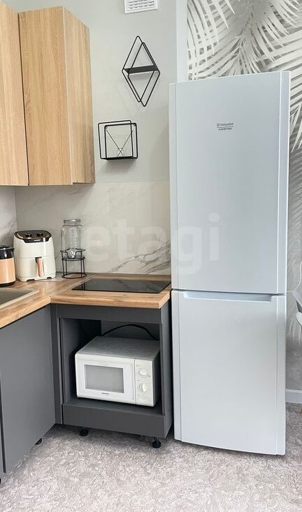 Квартира полностью меблирована и обставлена бытовой техникой, включая холодильник, стиральную машину, плиту и микроволновую печь.