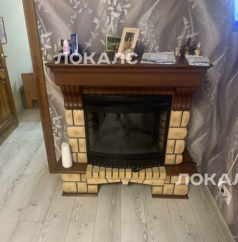 остается встроенная кухня с холодильником , электрокамин, встроенная полка для книг.