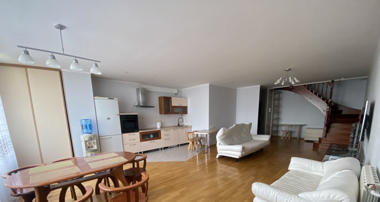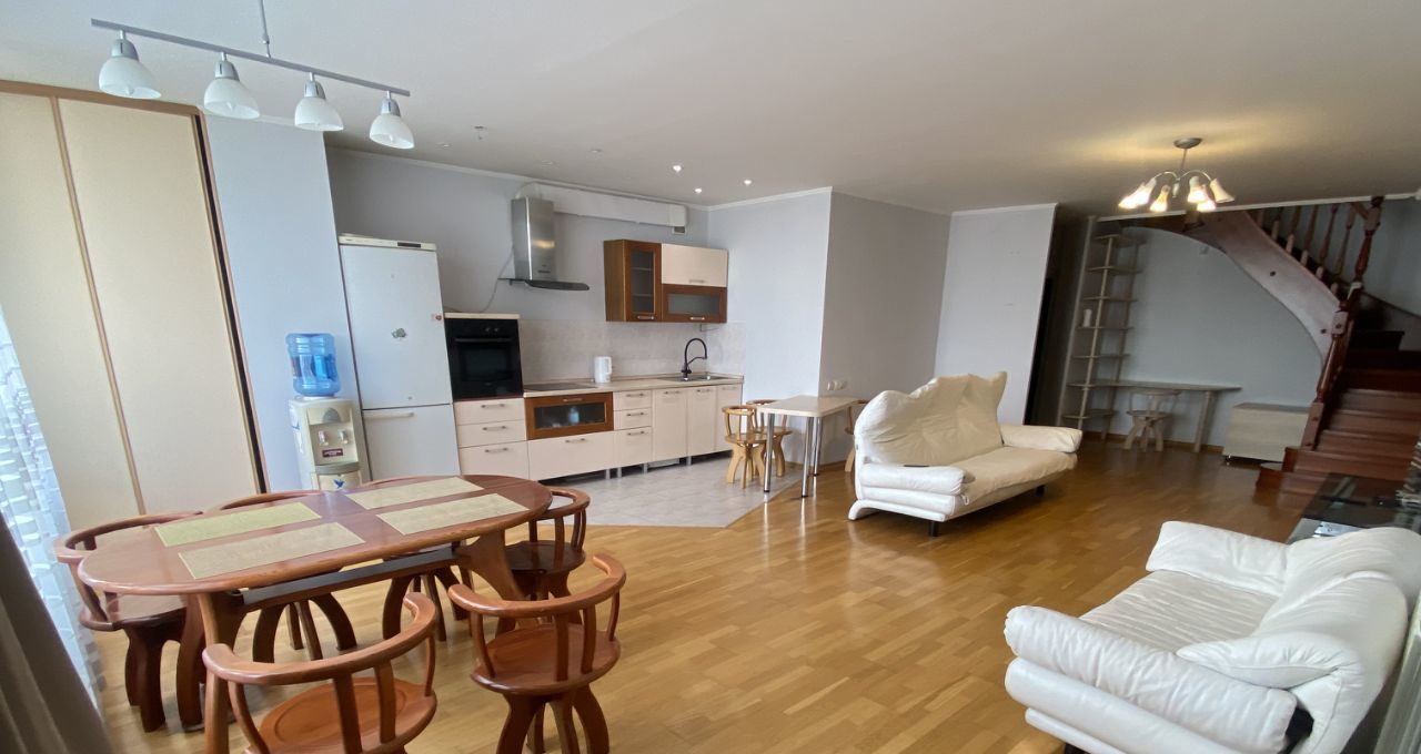 Сдаётся просторная двухуровневая трёхкомнатная квартира с евроремонтом в кирпичном доме на 8 этаже из 8. Общая площадь 120 кв. м. Окна выходят на улицу, что наполняет комнаты естественным светом. Дом был построен в 2004 году и оборудован пассажирским лифтом.