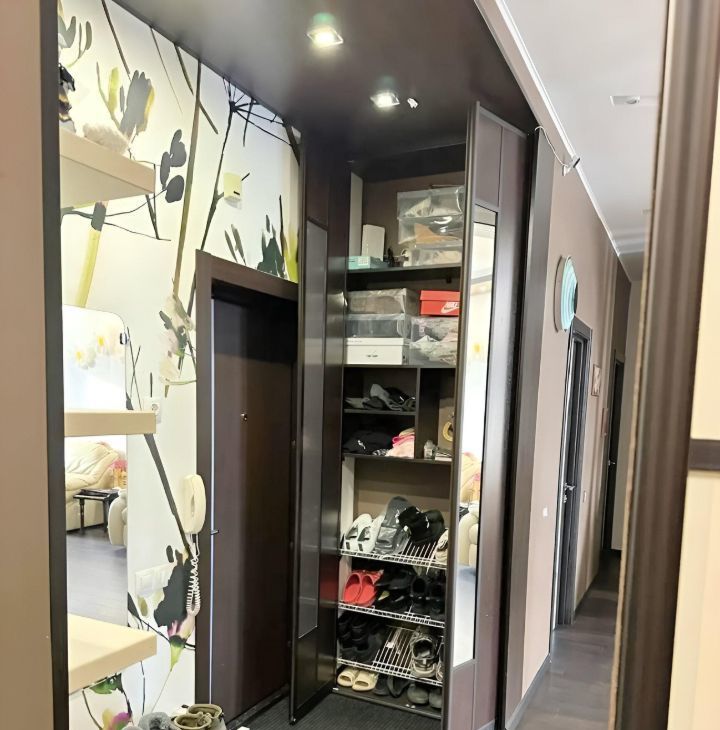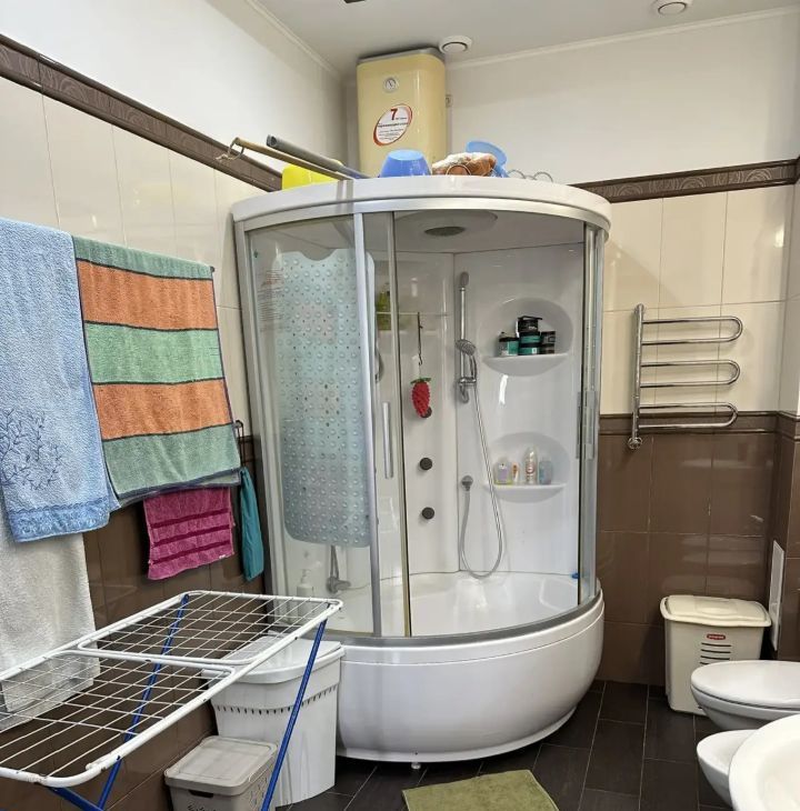 В квартире в 2014 году сделан капитальный и дизайнерский ремонт, стены, полы и потолки выровнены. в ванной комнате и на кухне регулируемый теплый пол. Имеется отдельная гардеробная комната, где установлена стиральная машинка. Потолки натяжные и ГКЛ. Кухонный гарнитур расположен вдоль одной стены протяженностью более 3м. встроенный холодильник, морозильная камера, посудомоечная машинка, микроволновка, духовой шкаф. Вся встроенная техника остается. имеется также вытяжка и варочная панель. В квартире есть один совмещенный санузел площадью 13.10 кв. м., где расположена душевая кабина, унитаз, биде и раковина с тумбой. В ванной комнате имеется встроенный шкаф для хранения белья. В детской имеется большой встроенный шкаф. В спальной комнате есть небольшая гардеробная. Из спальни есть выход на большой балкон, пол которого выложен плиткой. при необходимости балкон можно утеплить и продолжить спальную комнату. все балконы застеклены панорамными окнами. В зале 4 окна, стекла в которых были заменены. Из кухни имеется выход на небольшой балкон с видом на Енисей и правый берег. Полы в квартире застелены прочным ламинатом цвета венге, в кухне, ванной комнате и гардеробной керамогранит. В квартире остается всё освещение, встроенная техника, встроенные шкафы. Квартира очень теплая. на этаже расположены 5 квартир. Также на этаже имеется закрытое помещение - подсобка для хранения например велосипеда и шин.