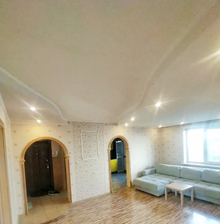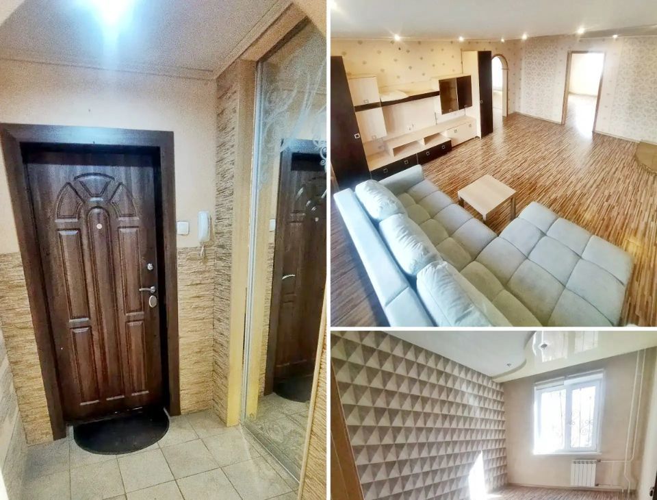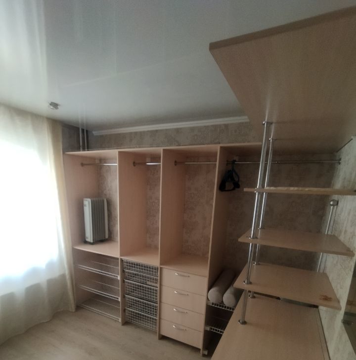 Квартира оборудована отдельной гардеробной комнатой. В гостиной установлен удобный диван, в спальне стоит двуспальная кровать, а детская комната свободна от мебели.