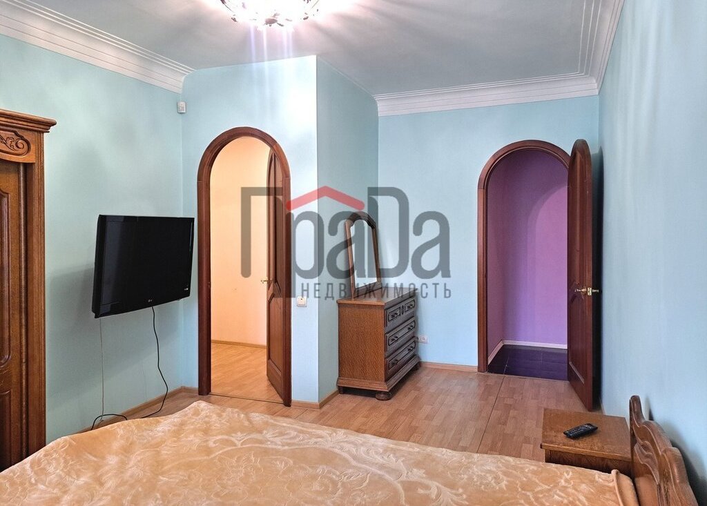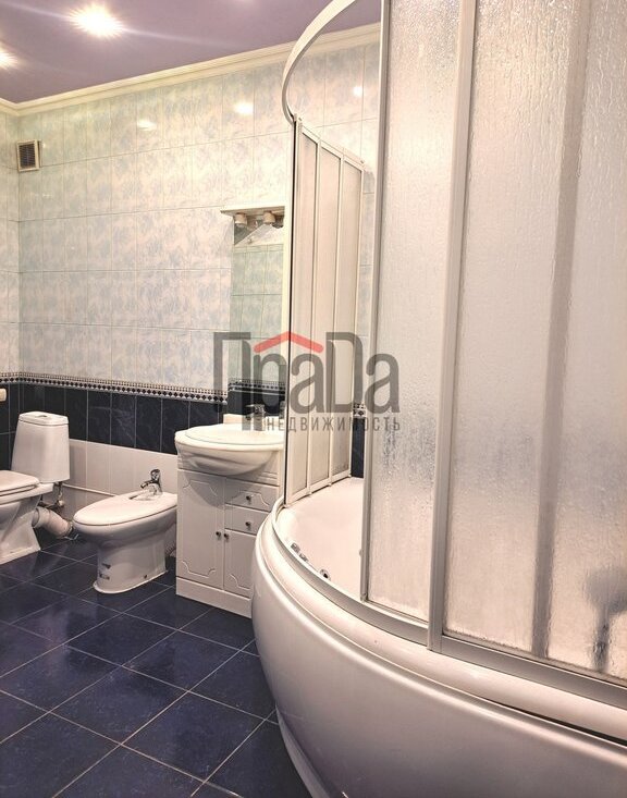 - просторная мастер-спальня: собственный санузел (унитаз, биде, джакузи), гардеробная, шкаф плательный, кровать двуспальная, прикроватные тумбы, комод, телевизор.