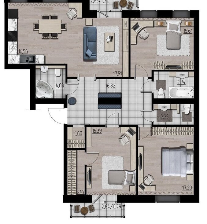 • 4 большие комнаты: Три изолированные спальни плюс огромная объединенная гостиная с кухней.