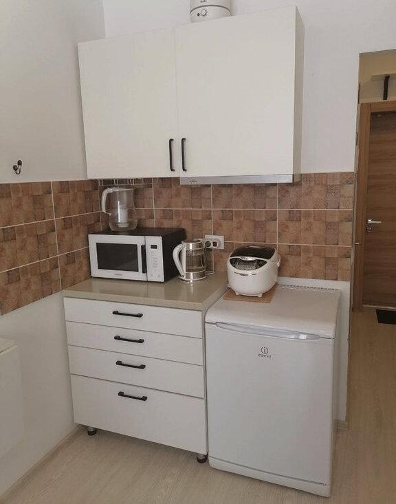 - кухонная зона: кухонная мебель, раскладной столик, холодильник, чайник и графин с фильтром, микроволновка, мультиварка и электрическая сковорода, вытяжка, увлажнитель воздуха.