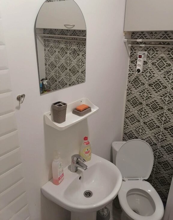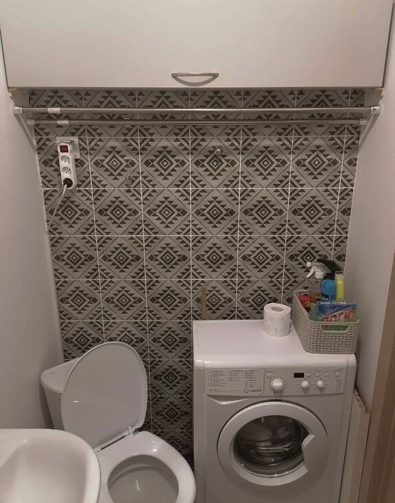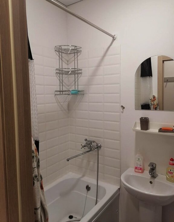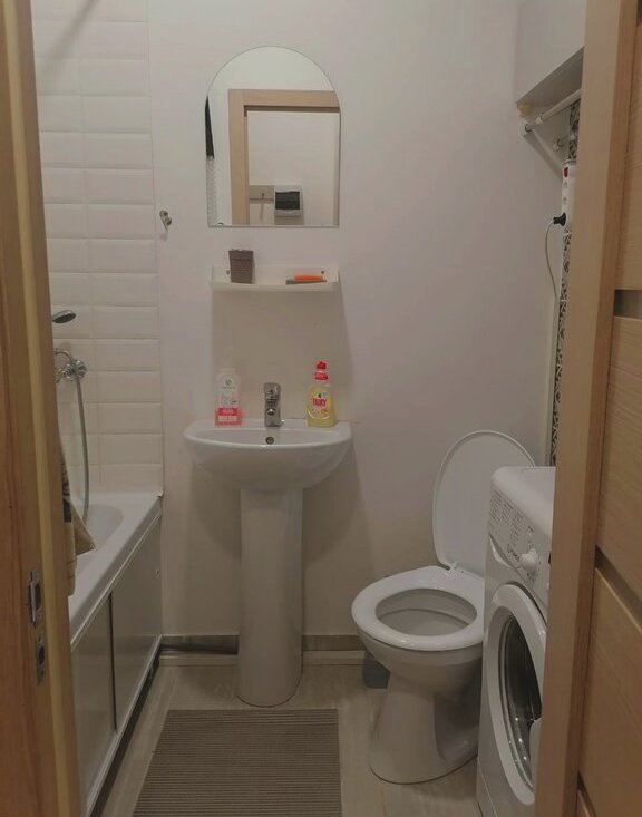 - ванная: ванна с удобным бортиком, раковина, зеркало, стиральная машинка, зона сушки. Свежая гидроизоляция труб.