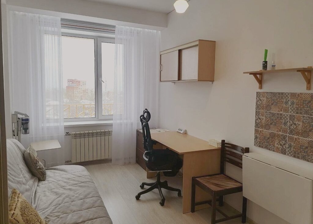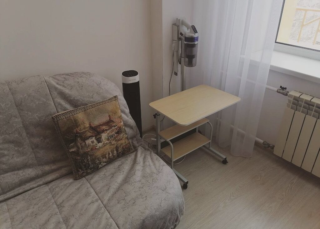 - зона отдыха: удобный раскладной диван с новым чехлом, вместительный шкаф с большим зеркалом, прикроватный столик на колёсиках, офисный стол и мягкое катающееся кресло, комод, настенная полка для хранения книг и вещей, пылесос для уборки помещения, стремянка для доступа к верхним полкам.