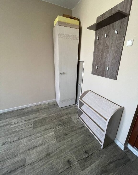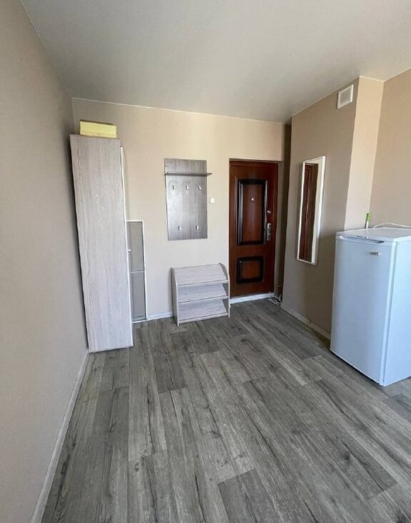 Комната полностью готова к проживанию — заезжай и живи. Сделана аккуратная прихожая, отделяющая основное пространство. Шкаф для одежды и белья. Обеденная зона: стол и табуретки.