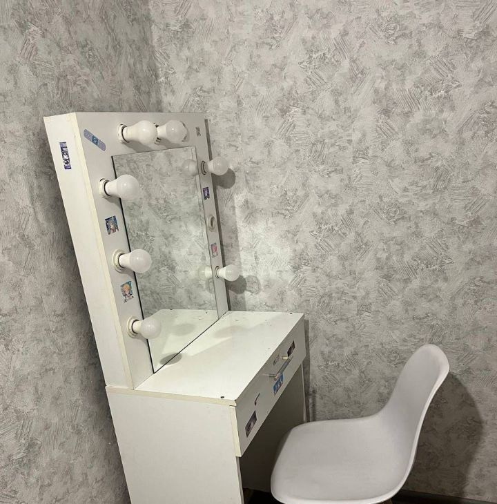 кухонный гарнитур, плита ( газ ), холодильник, микроволновка, чайник, стол, стулья, кровать, шкаф, комод, вешалка для одежды, компьютерный столик, гримерное зеркало с подсветкой, стиральная машина.
