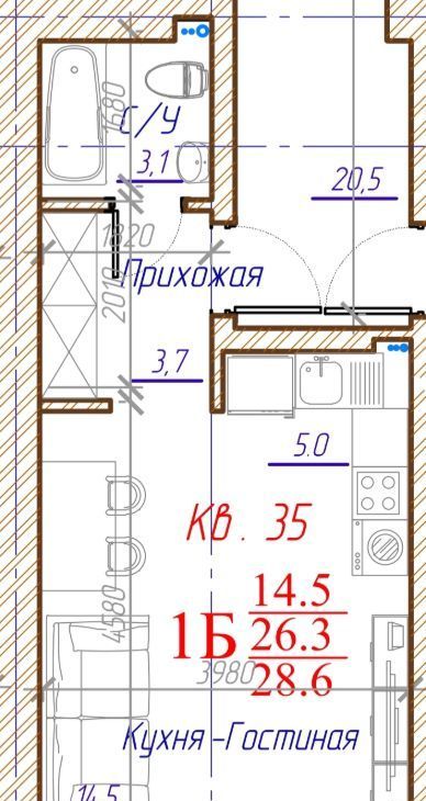 Студия Красноярский край, Красноярск Краснодарская ул., 40/2 (26.2 м²)