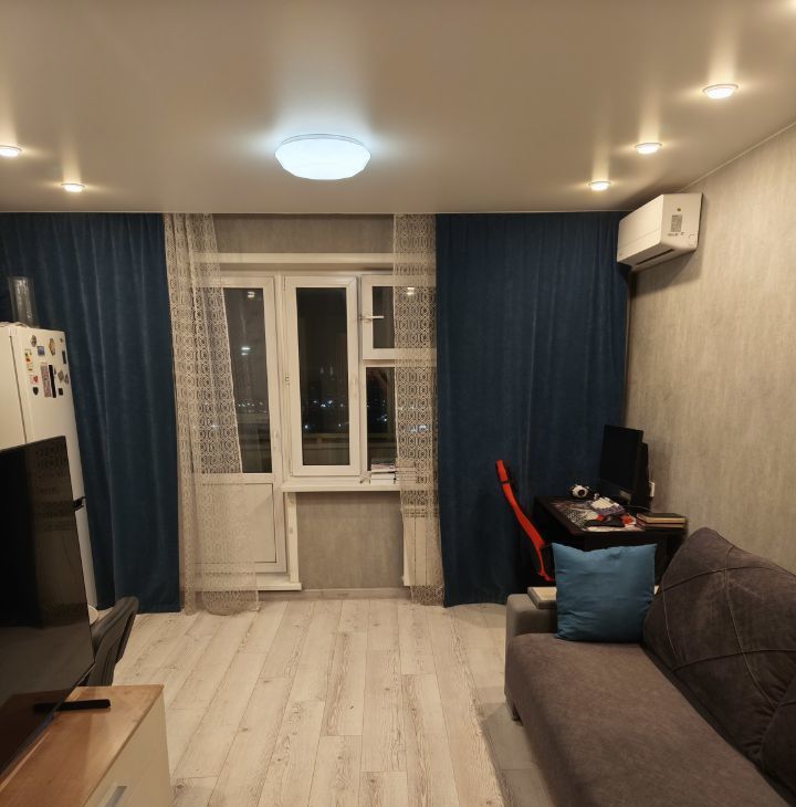 уютную жилую зону с диваном, большим Smart TV и кондиционером.