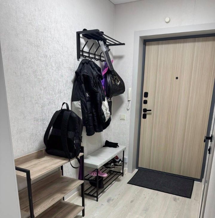 В прихожей вешалка, полка под обувь, комод.