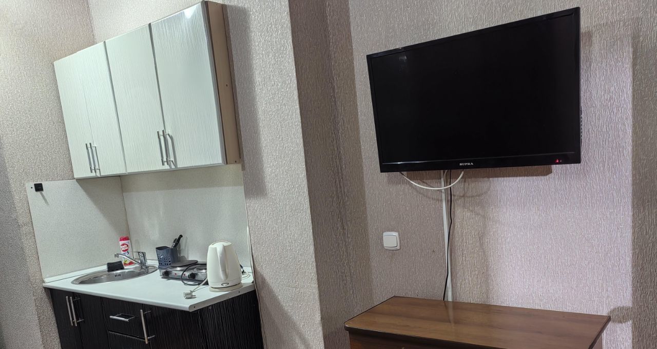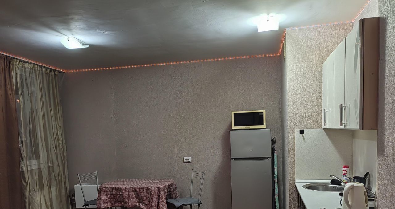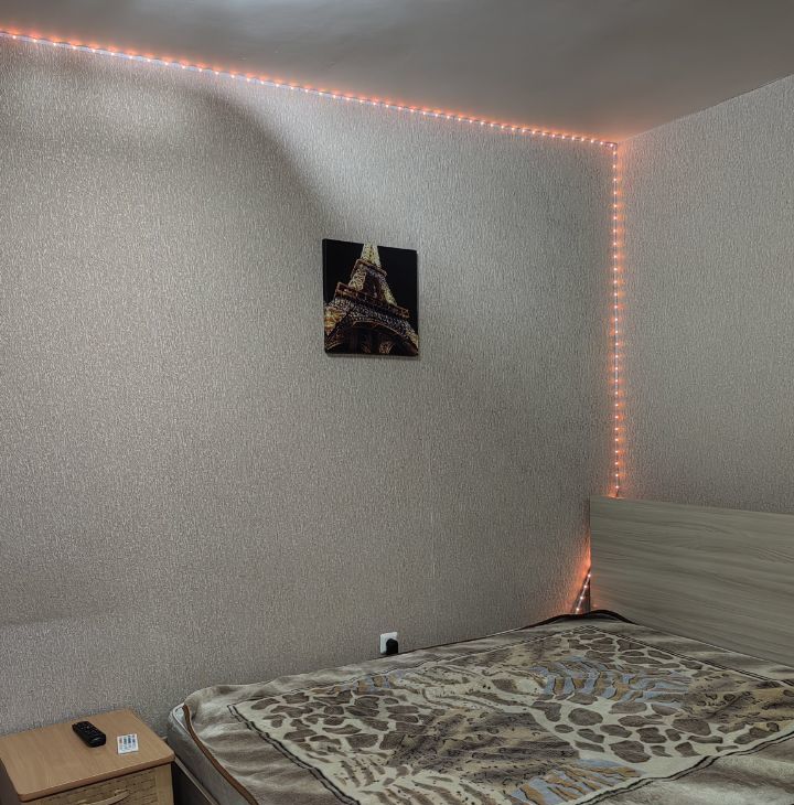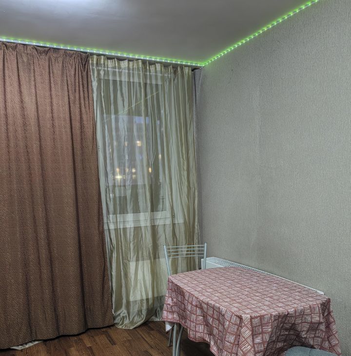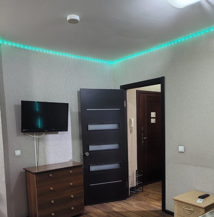 Квартира-студия. Ремонт скромный, по периметру потолка светодиодная лента, управляется с пульта, меняя цвета. Очень уютно и романтично ) Комната с дверью, есть прихожая. Имеется мебель: кровать 2 сп, шкаф, стол, стулья, комод, кухня. Есть техника: холодильник, телевизор, утюг, чайник, плита,микроволновка. В ванной кафель, стиралка. Сантехника чистая и белоснежная.