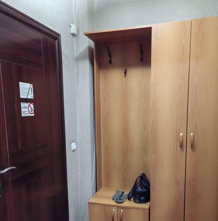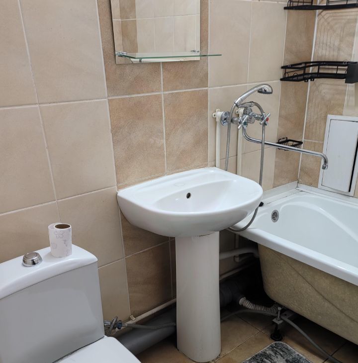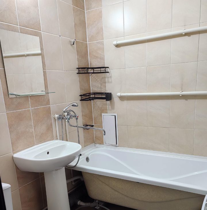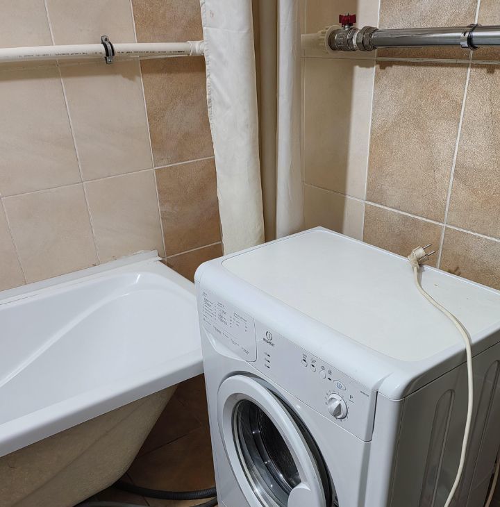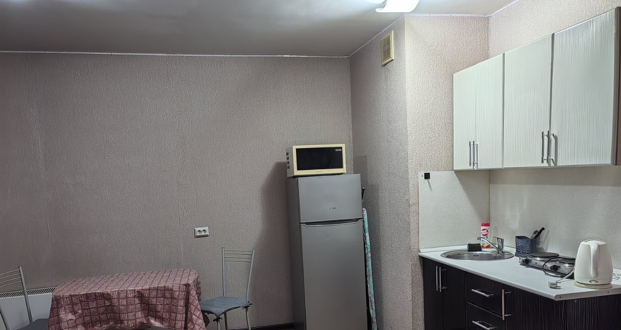 Квартира-студия. Ремонт скромный, по периметру потолка светодиодная лента, управляется с пульта, меняя цвета. Очень уютно и романтично ) Комната с дверью, есть прихожая. Имеется мебель: кровать 2 сп, шкаф, стол, стулья, комод, кухня. Есть техника: холодильник, телевизор, утюг, чайник, плита,микроволновка. В ванной кафель, стиралка. Сантехника чистая и белоснежная.