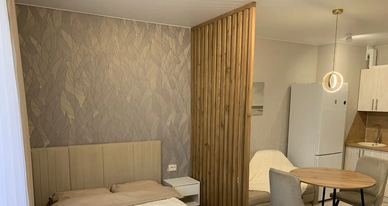 • Разделение спальной и кухонной зон стильной деревянной перегородкой;