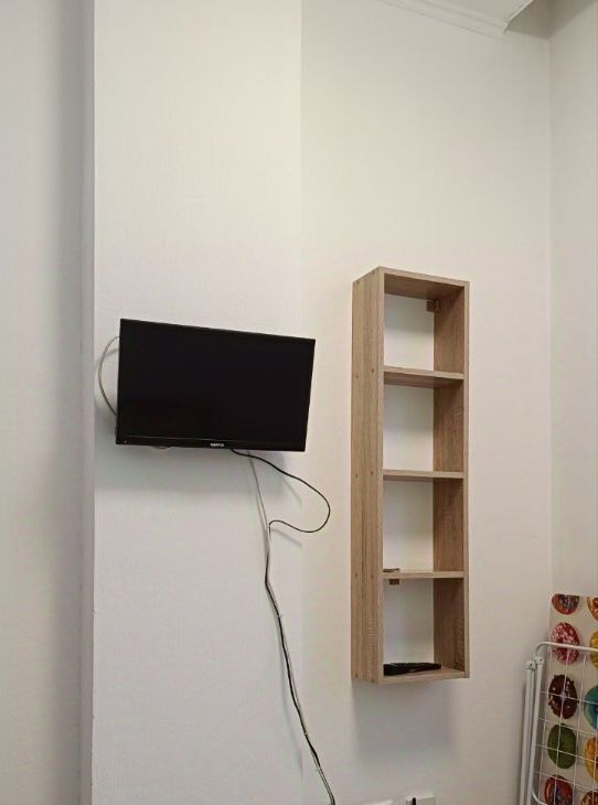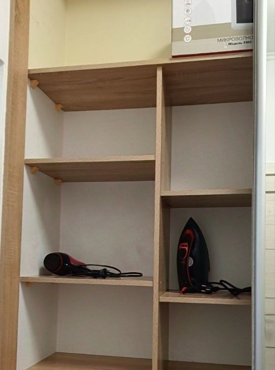 1,5 спальная кровать, кухонный гарнитур (плита, микроволновая печь, холодильник, чайник, посуда, кухонные приборы и принадлежности для приготовления пищи, встроенный шкаф для вещей, стиральная машина, телевизор, фен, утюг, гладильная доска.